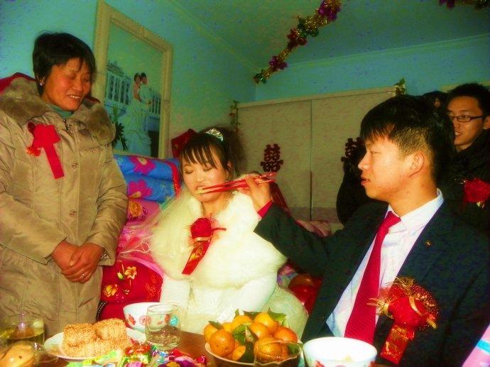 新娘到家后,老家人会煮几个饺子,过水就捞出来让新娘吃,还要问句生不生。